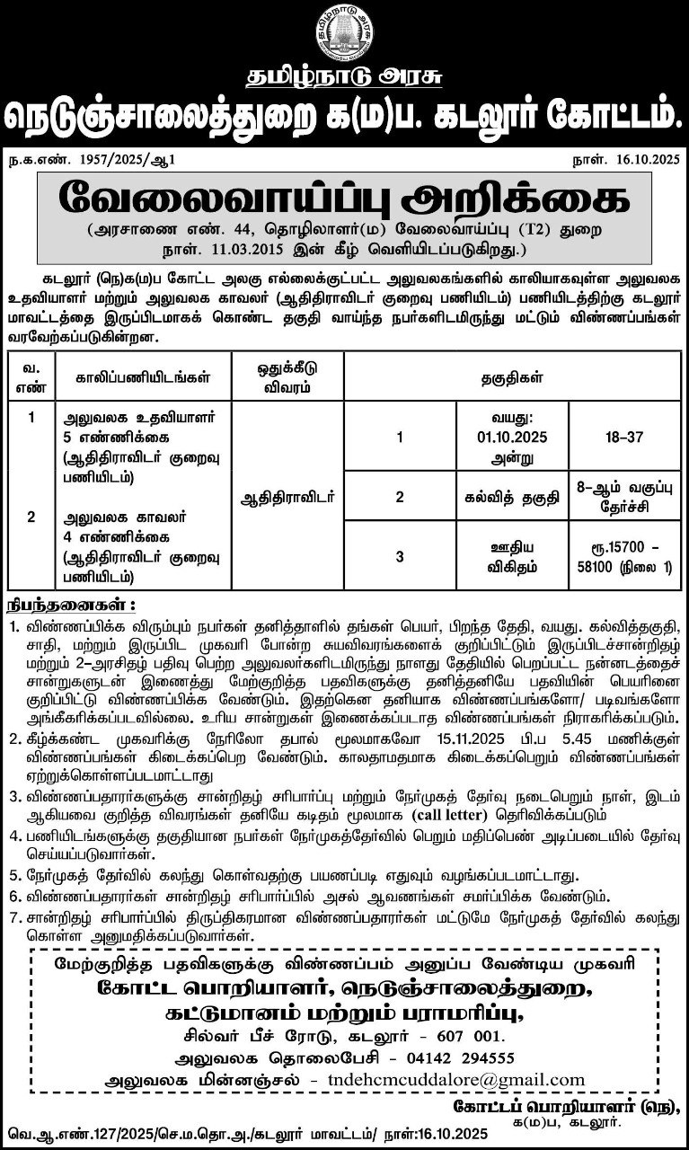 | TN Highways Department (Cuddalore) Office Assistant Recruitment 2025 | TN Highways Department | 9 | 8th | 15-11-2025 | |